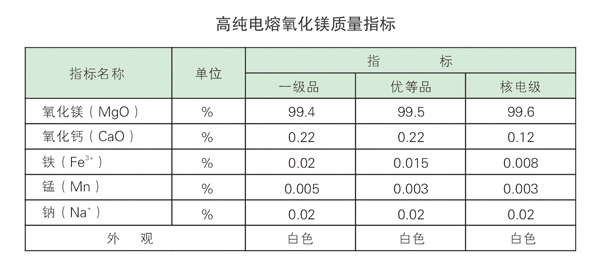 我公司高純電熔氧化鎂制作采用氧化鎂(苦鹵)和碳酸鈉(純堿)化學合成制得的試劑級高純氧化鎂(海水鎂)經(jīng)3300度電熔爐熔煉而成。此工藝制得的電熔氧化鎂純度高(可達99.9%),密度大(3.57g/ml)、晶體透明度好,具有優(yōu)良的電絕緣性和熱傳導性(60W/mk),主要用于國防軍工、耐火材料、電熱電器、鎧裝偶絲等行業(yè),產(chǎn)品質(zhì)量各項指標達到或超過美國日本同類產(chǎn)品水平。年產(chǎn)量280噸。